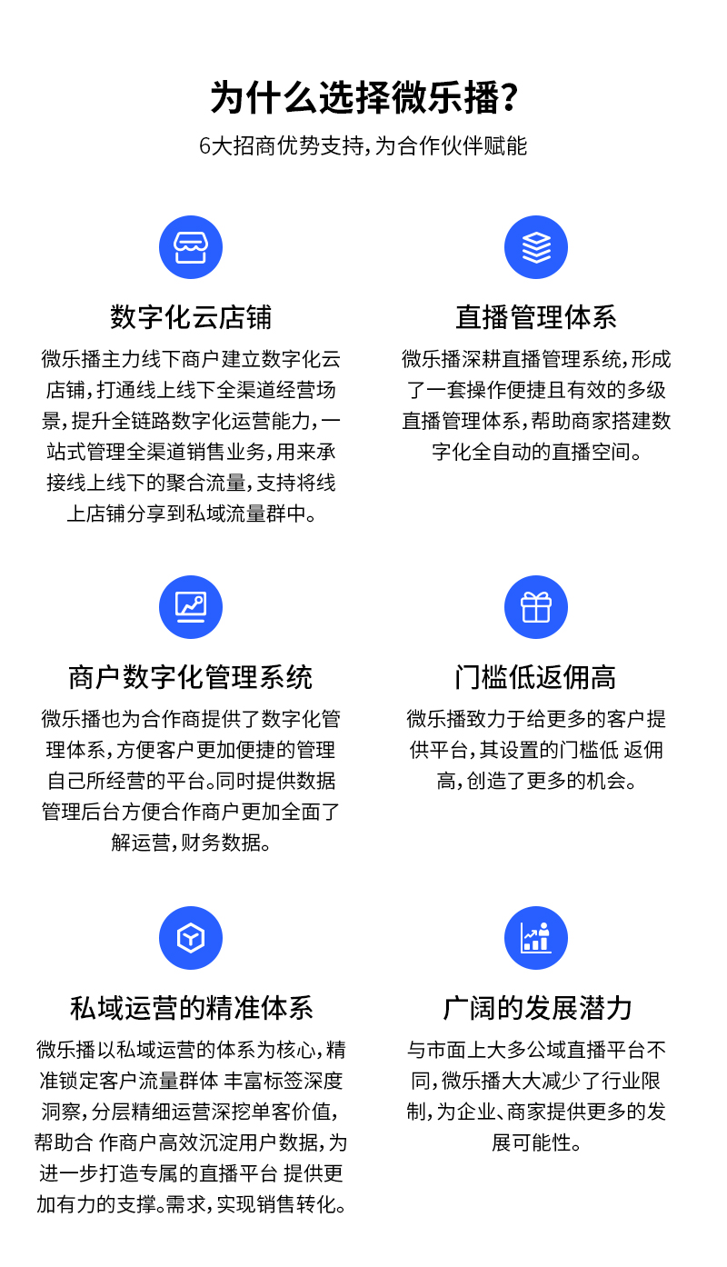 微乐播以私域运营的体系为核心,精准锁定客户流量群体 丰富标签深度洞察,分层精细运营深挖单客价值,帮助合 作商户高效沉淀用户数据,为进一步打造专属的直播平台 提供更加有力的支撑。需求,实现销售转化